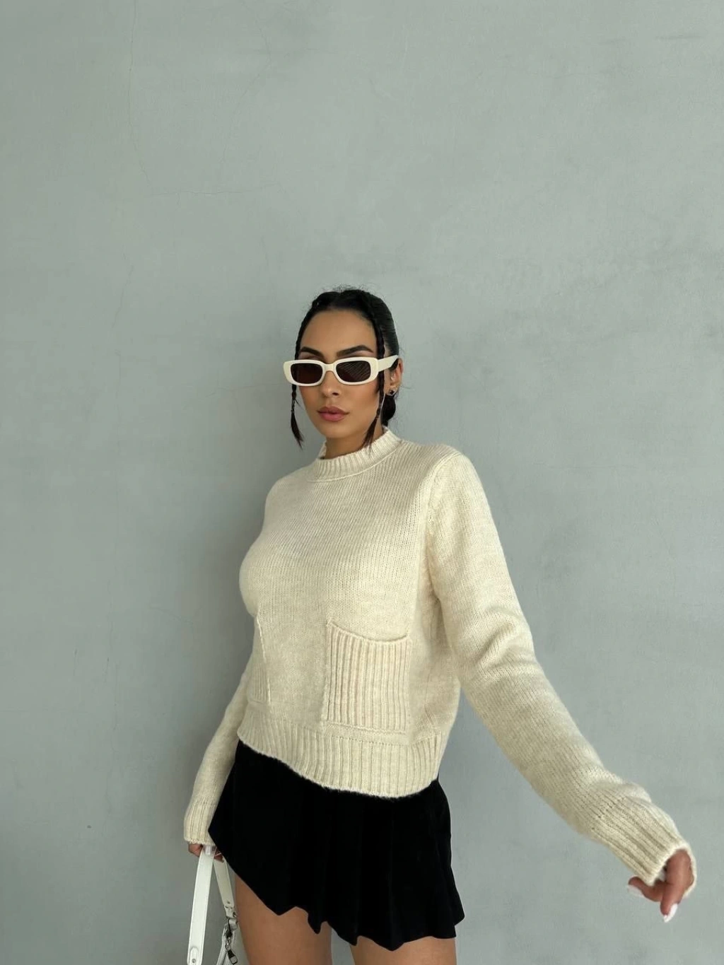 Yumuşak ve şık bir görünüm arayan kadınlar için ideal olan Cepli Triko Kazak Krem, gardırobunuzun vazgeçilmezi olmaya aday!