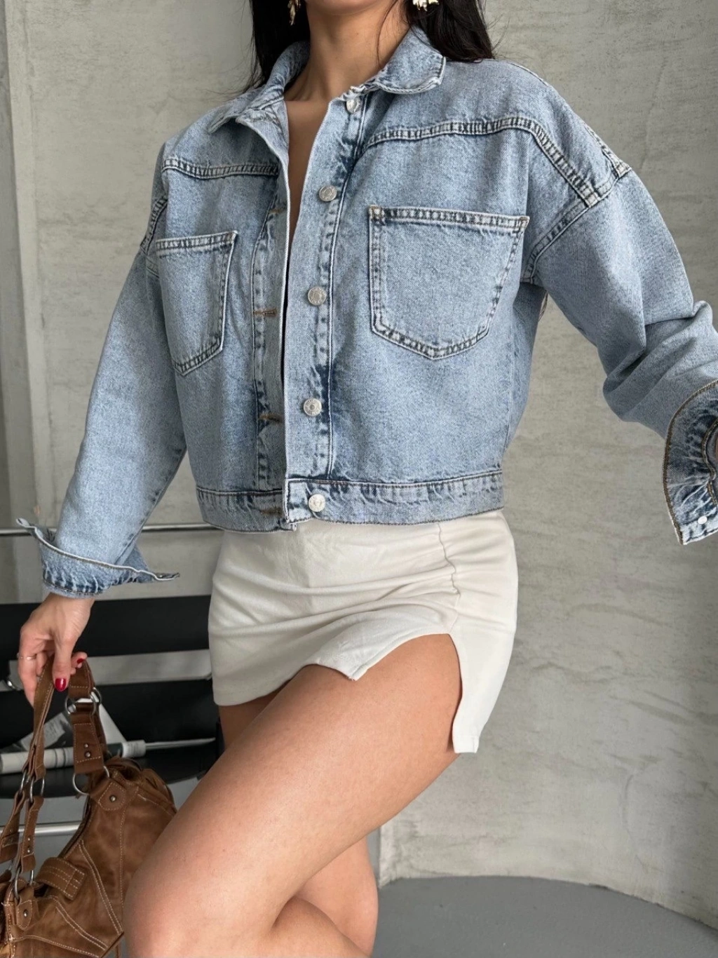 Modern tasarımıyla öne çıkan Çift Cepli Kol Katlamalı Kar Yıkama Crop Kot Ceket Buz Mavi D2000, gardırobunuzun vazgeçilmez parçalarından biri olmaya aday.