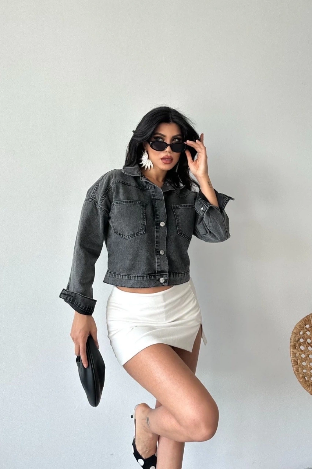 Yeni sezonda sokak modasına yön veren çift cepli kol katlamalı süper taş enzim yıkama crop kot ceket ile tarzınızı ön plana çıkarın.