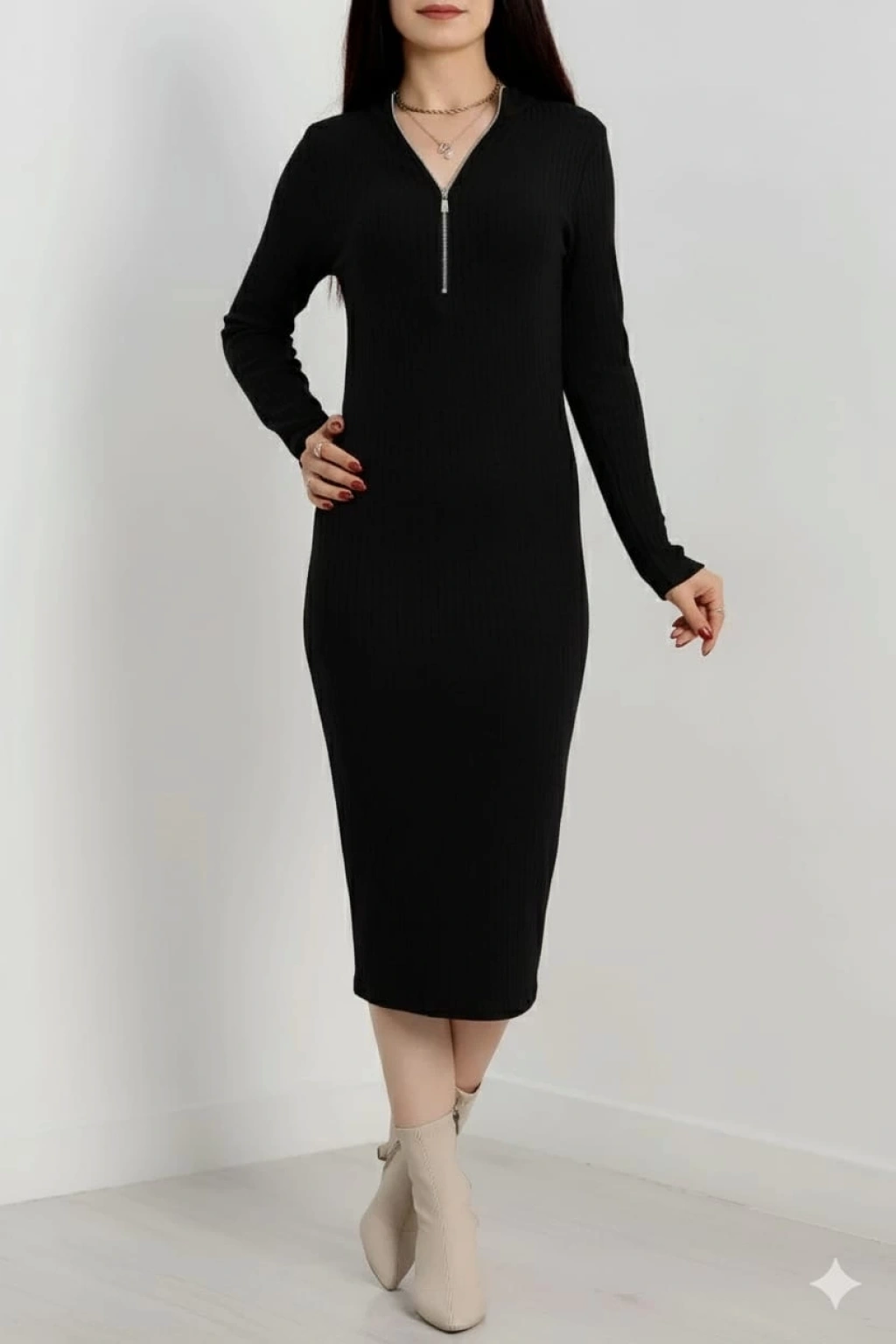 Bu şık elbise, vücudu saran fitilli kesimiyle modern bir görünüm sunarken, fermuar detayıyla da fark yaratıyor.
