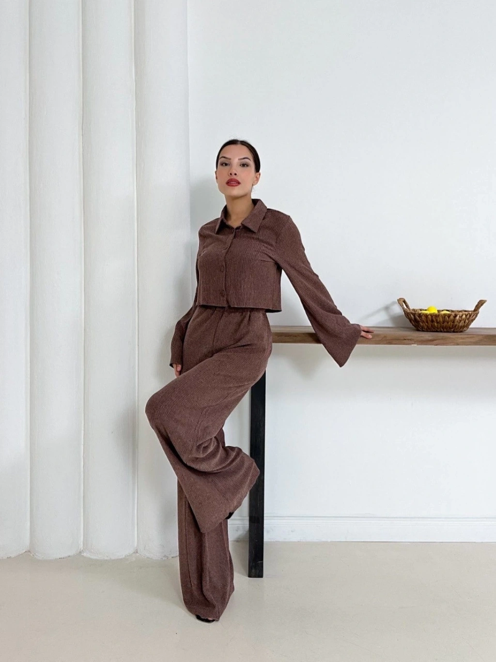 Gömlek yaka kaplama düğmeli takım kahve st265866