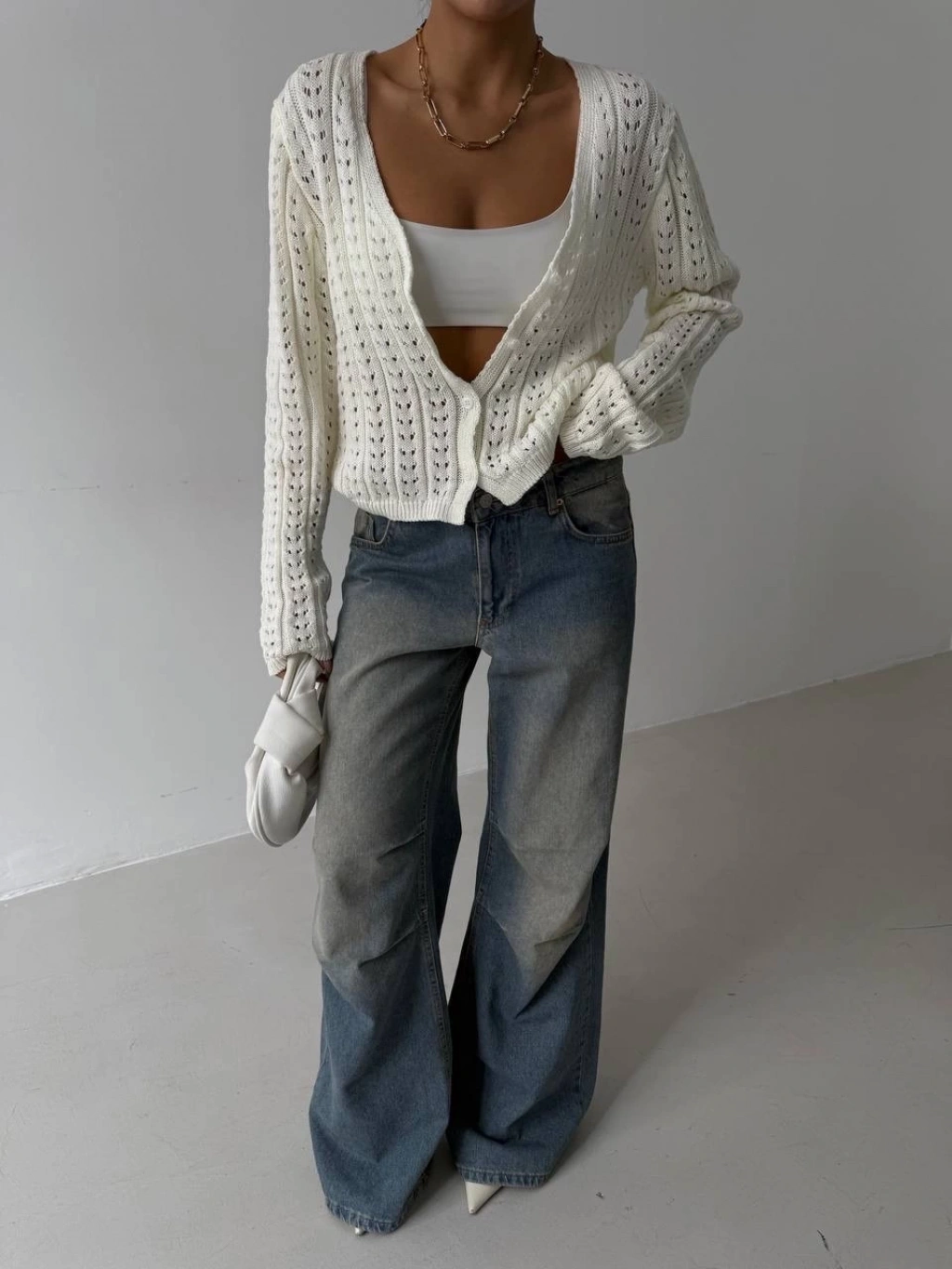 Küçük düğmeli küçük örgülü triko hırka beyaz