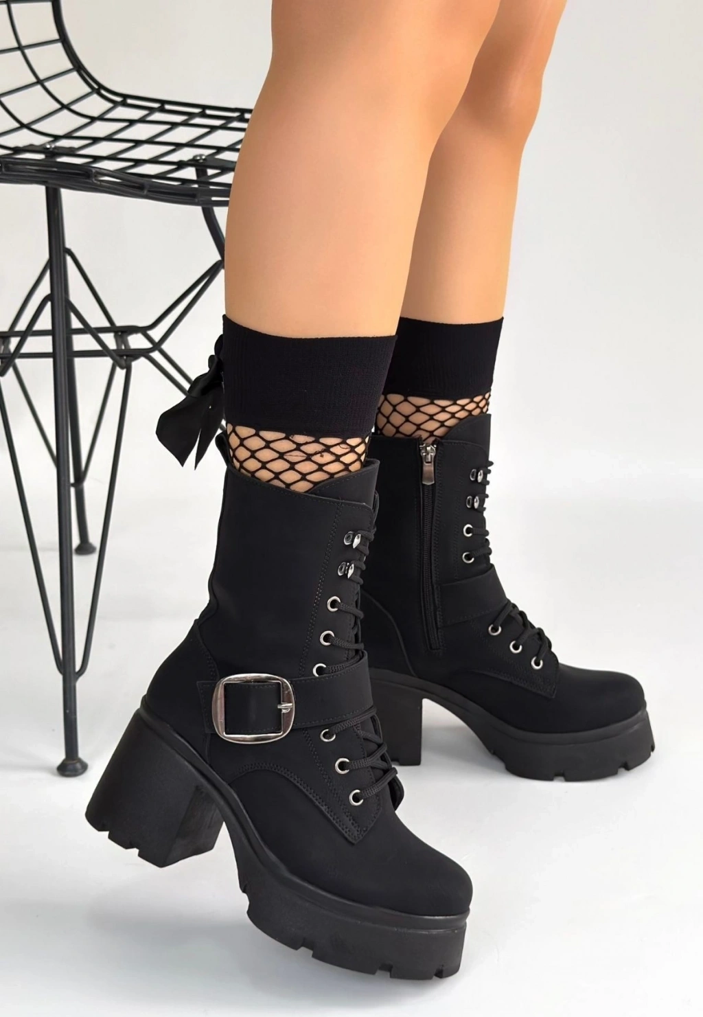 • Linma Siyah Nubuk Bağcıklı Topuklu Bot