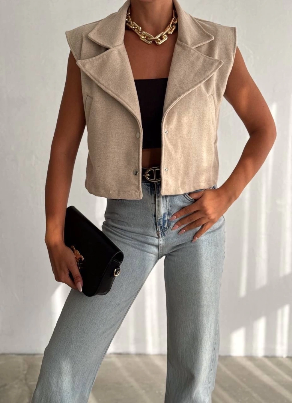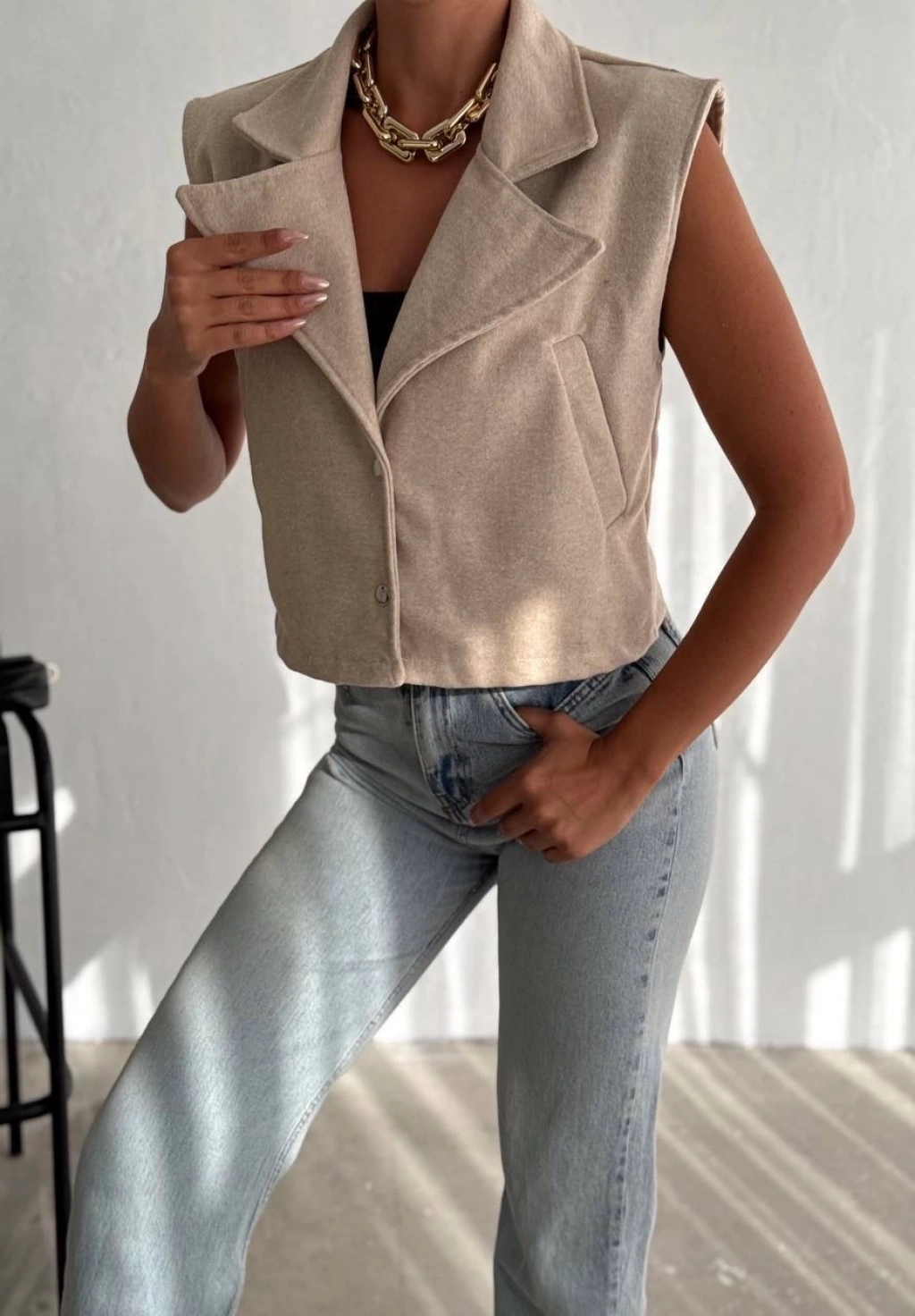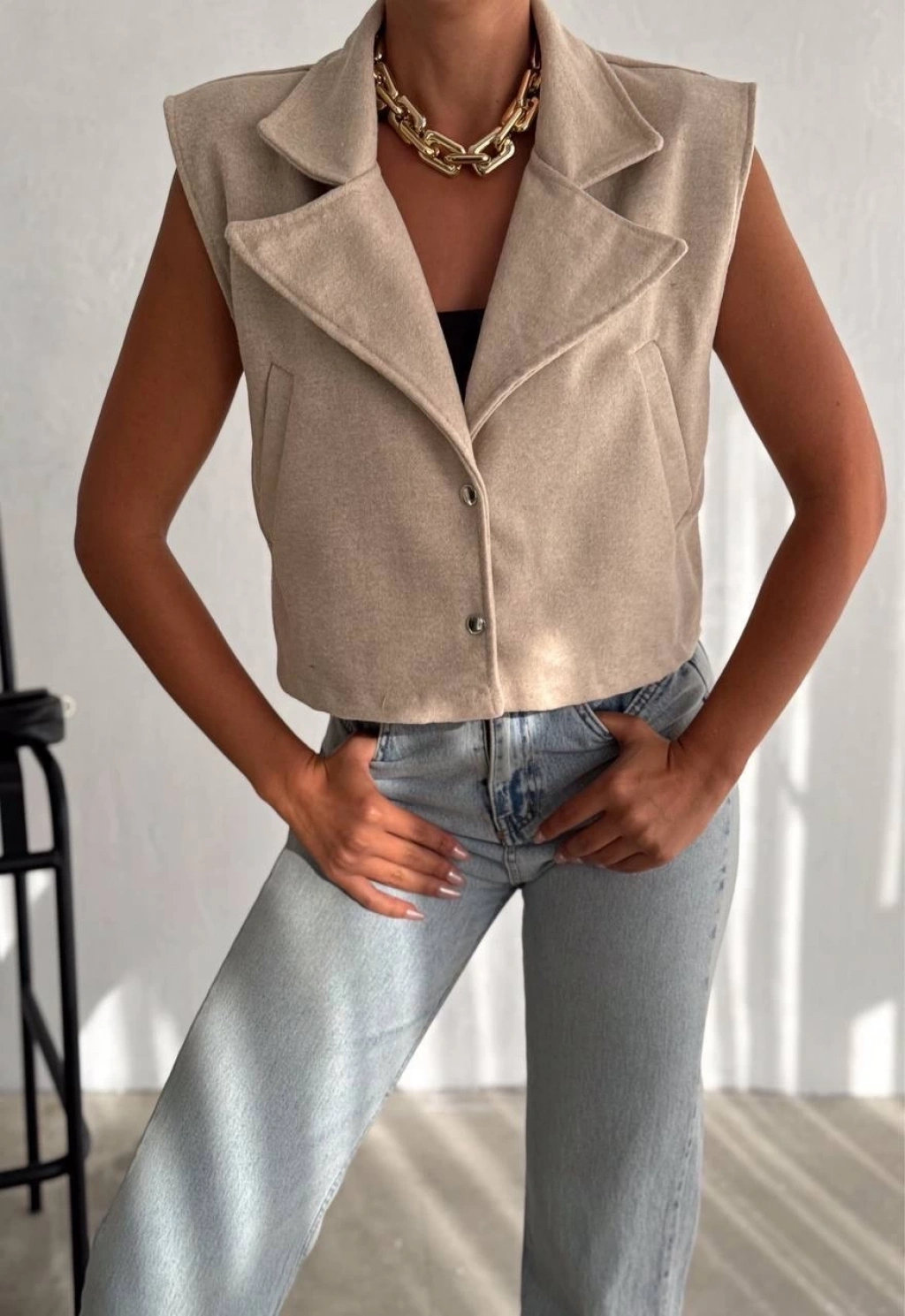 Önü çıtçıtlı cepli kaşe yelek bej f2253, şıklığı ve pratikliği bir arada sunar.