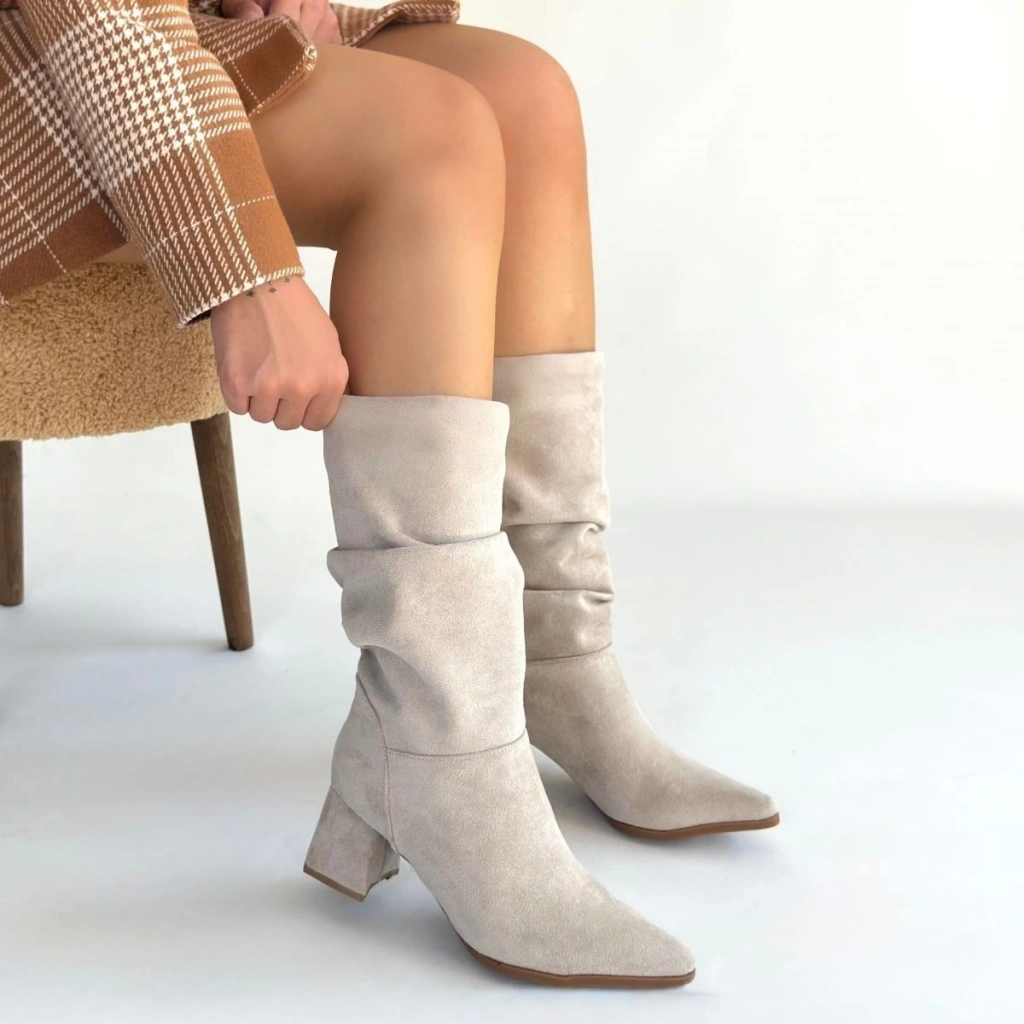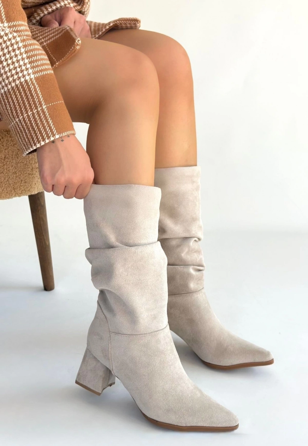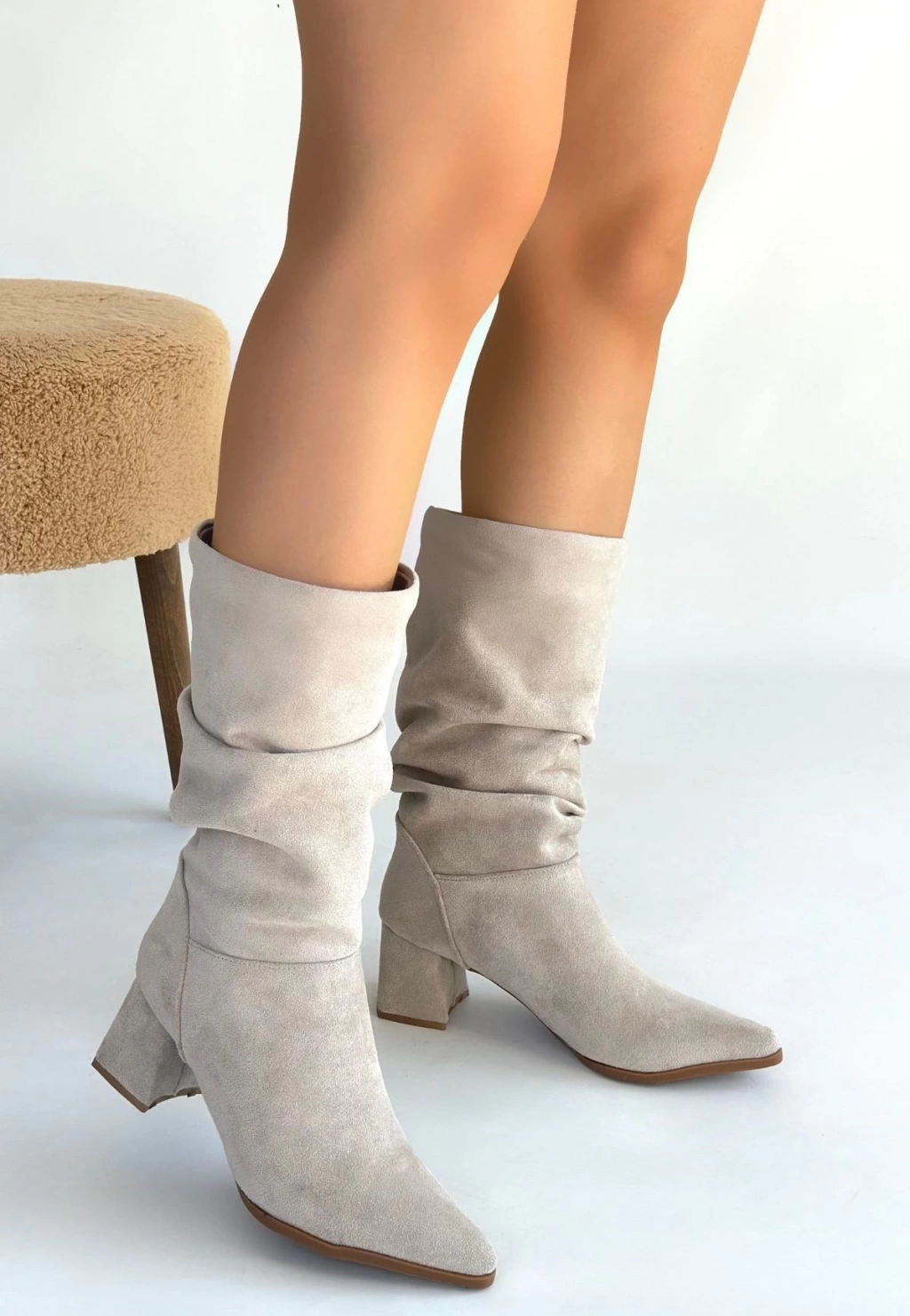 • Titen Bej Süet Körüklü Topuklu Çizme