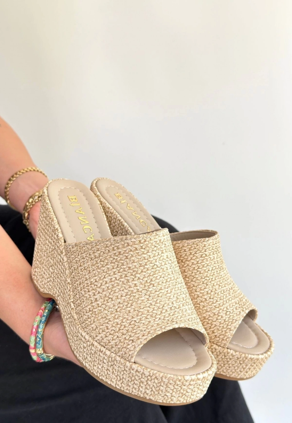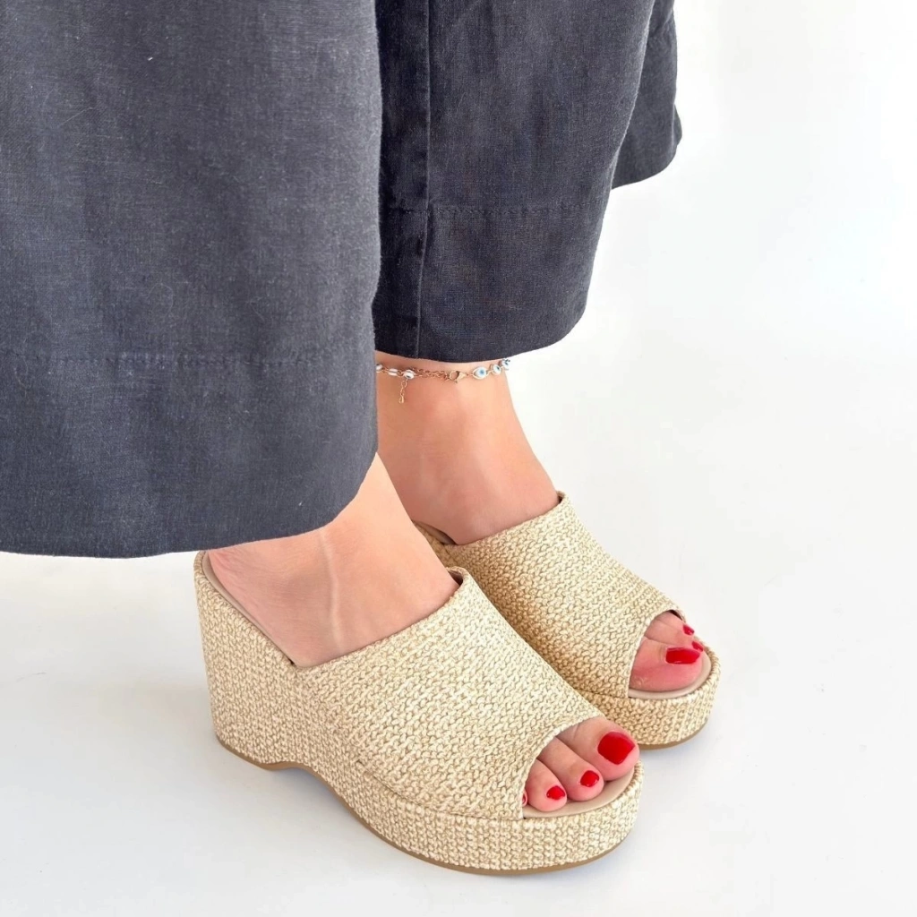 Tlay Bej Hasır Dokumalı Dolgu Topuk Terlik